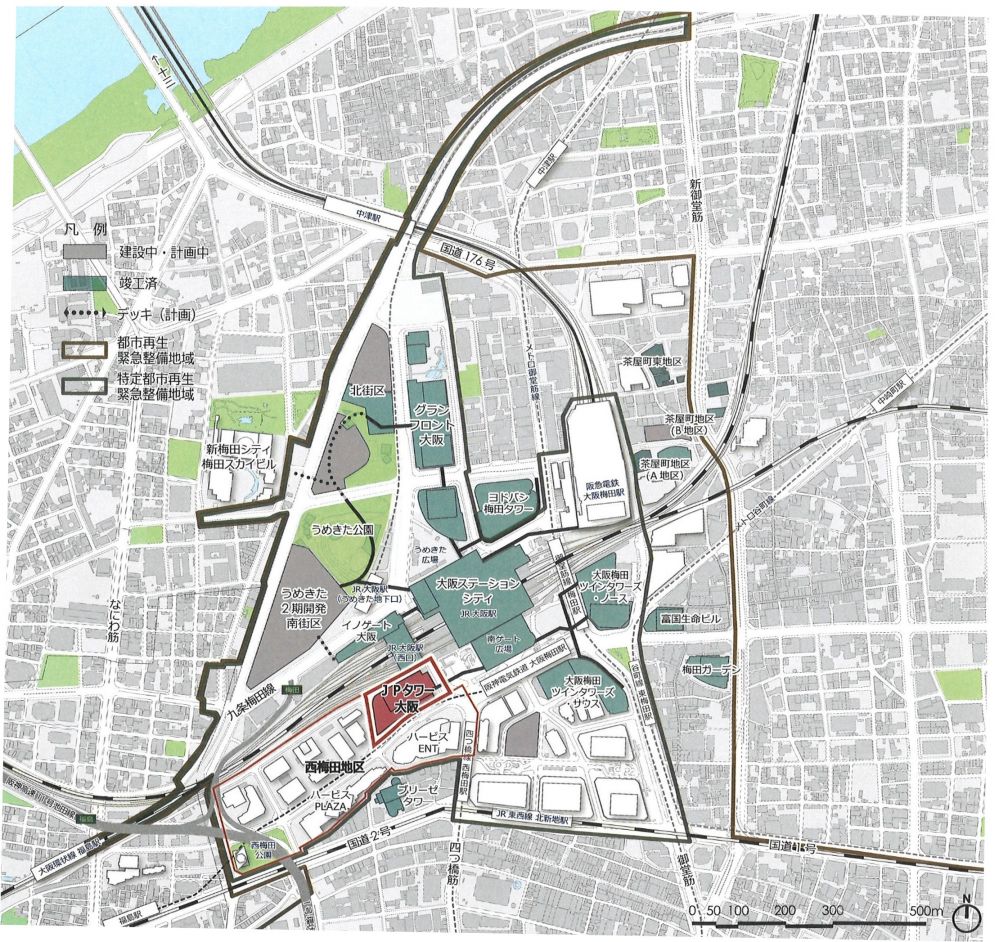 JP TOWER大阪為該計畫的關鍵項目之一,位於大阪舊中央郵局舊址,是一座結合購物(KITTE大阪)、劇場(Sky Theater MBS)、飯店(THE OSAKA STATION HOTEL)、辦公室及頂樓庭園的大型複合式建築,並已於2024年陸續開幕,成為梅田地區連結商業、文化與交通的重要節點,象徵大阪都市再生的嶄新篇章。