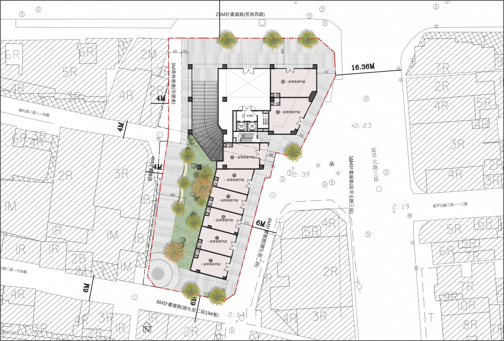 本案西側計畫道路原為住宅區,經1979年5月28日細部計畫變更為道路用地,但地上建物早於1958年前就已經存在,當時擬訂細部計畫時未考量實際現況,造成目前計畫道路上佈滿建物且產權複雜,然而因計畫道路未完全開闢,迪化街二段214巷無法於都市更新程序中辦理巷道廢止,僅能依臺北市現有巷道廢止或改道自治條例規定申請改道。雖與原規劃設計方案不同,但改道後巷道寬度仍達3公尺,並配合本案協助開闢部分道路用地及基地內退縮,與更新前狹窄巷道相比,已提供更寬敞安全的通行環境。