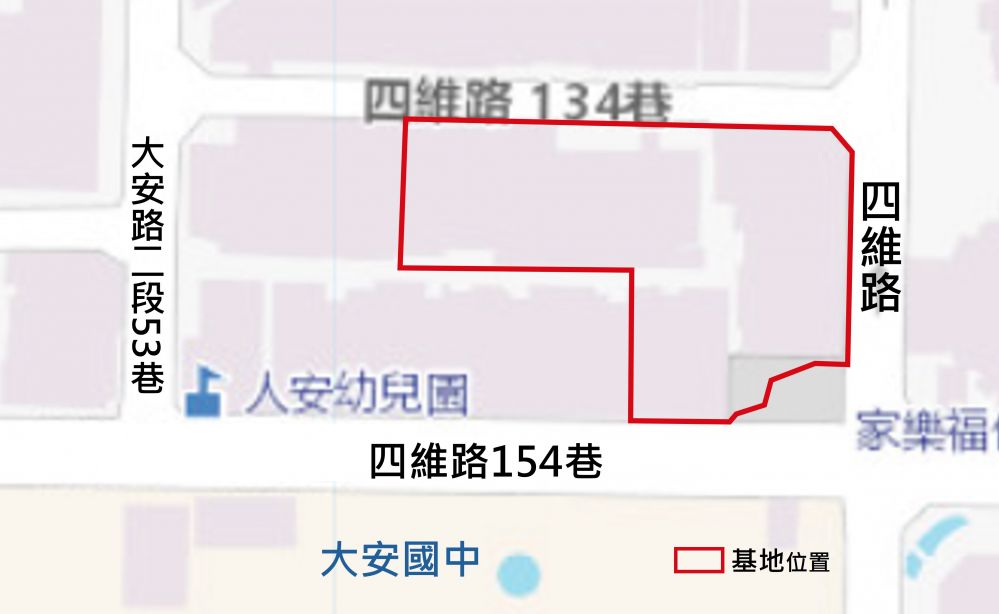 基地位置 | 四維路以西、四維路154巷以北、大安路二段53巷以東及四維路134巷以南所圍街廓北側 |