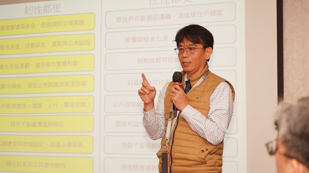 新北市都市更新學會簡文彥理事長對當前都更的價值取向提出了深刻反思,此番反思也引發與會專家的廣泛共鳴,點出當前制度的核心矛盾。他將現行模式比喻為一場追求容積獎勵的遊戲,認為現況系統鼓勵個案追求自身利益最大化「任性」,但所有個案的「任性」加總,卻未必能成就一個更宜居、更有「韌性」的城市。這場以市場驅動的價值捕獲遊戲,忽略了那些無力參與更新或無力購買新建高價住宅的群體,可能加劇社會不均,這是整個產業必須共同面對的深層課題。