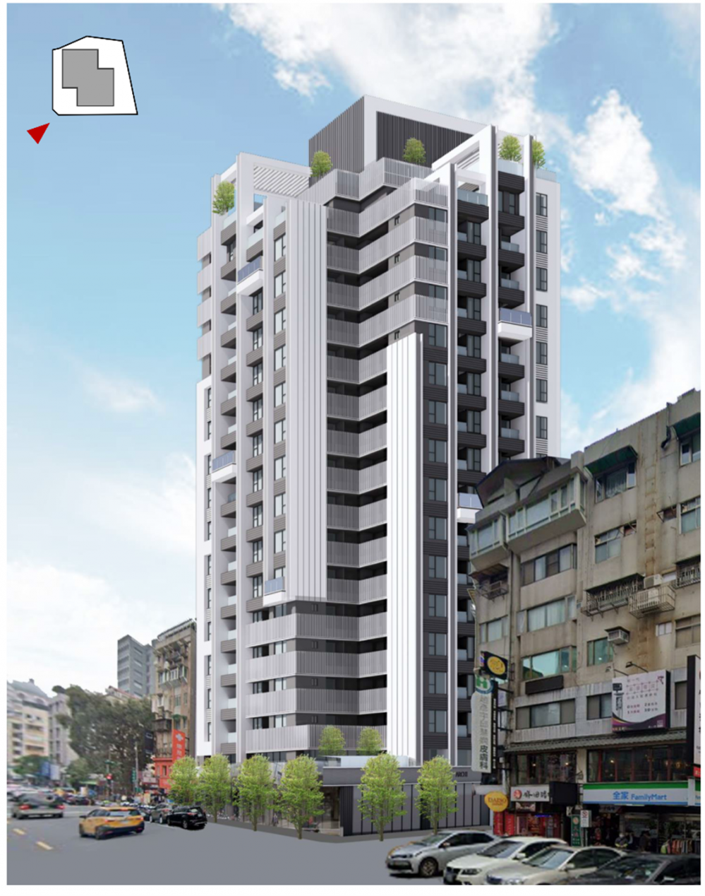 更新後的建築規劃擬興建一棟地上17層、地下5層的SRC結構大樓,座落於轉角基地。設計理念著重於立面主體性,透過轉角退縮虛體,減少量體連續牆面,營造流動與呼吸感,緩解街道及都市空間的壓迫感。外觀材質以灰色石材為基調,搭配垂直線條與霧銀格柵,增添律動感,避免量體過於厚重產生壓迫感;水平格柵串聯虛體,形成非對稱的韻律感,使立面更具活力。造型設計則結合垂直錯落框體與帶狀隔柵,於量體的虛實之間創造豐富層次,展現現代建築風格。轉角退縮露台及錯落綠化露台由下而上延伸至屋頂平台,增添綠意並豐富城市天際線。量體方位採坐東北朝西南,並利用陽台設計優化自然通風與日照採光,達成節能目標,呼應當代永續潮流。