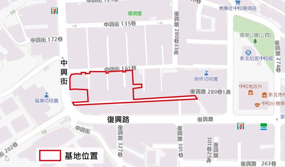 | 基地位置 | 中興街、中興街161巷、復興路280巷及復興路所圍街廓西側範圍內 |